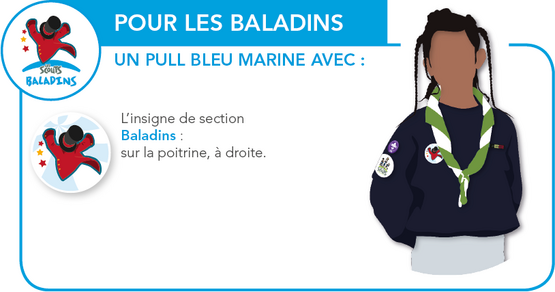 Chez les baladins, nous demandons le pull bleu marine des baladins avec l'insigne de section, l'insigne des scouts et si possible l'insigne de Bruxelles Woluwé, le foulard de l'unité.