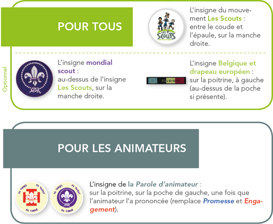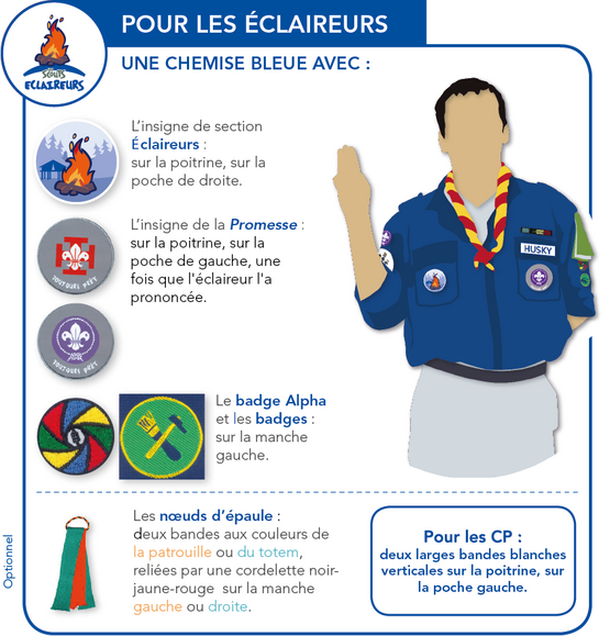 Chez les éclaireurs, nous demandons la chemise bleu des éclaireurs avec l'insigne de section, l'insigne des scouts et si possible l'insigne de Bruxelles Woluwé, le foulard de l'unité.