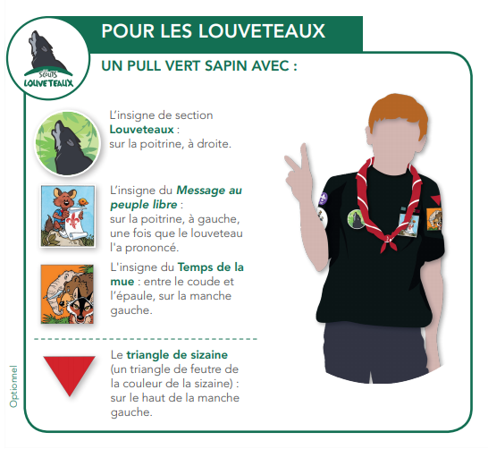 Chez les loups, nous demandons le pull vert des loups avec l'insigne de section, l'insigne des scouts et si possible l'insigne de Bruxelles Woluwé, le foulard de l'unité.